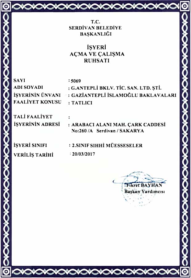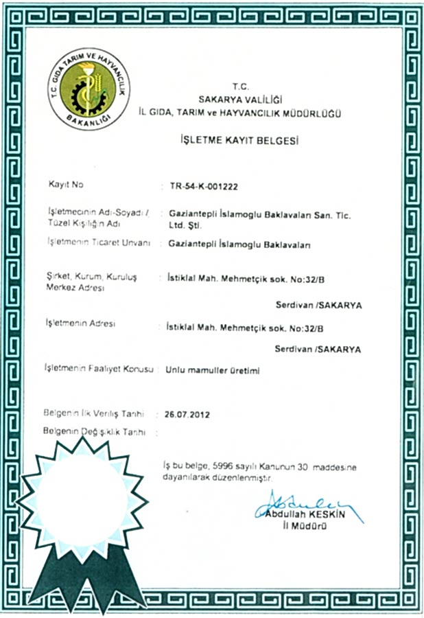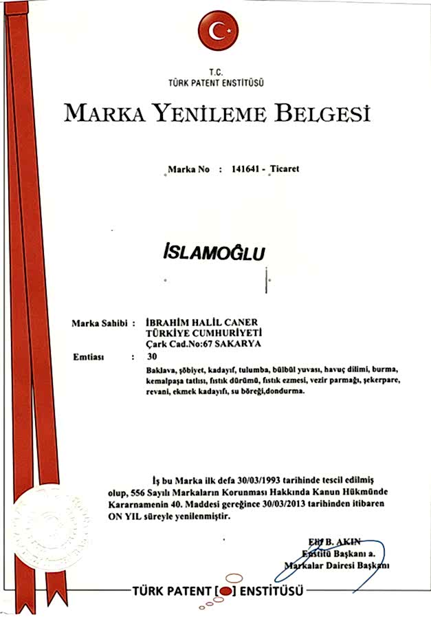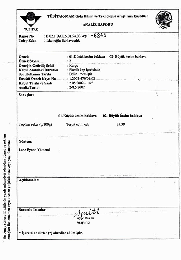 İslamoğlu Baklavaları, üretim için gerekli olan tüm izin belgelerine ve sertifikalarına sahip olup, diyet baklavamızın Tübitak'tan raporu mevcuttur.